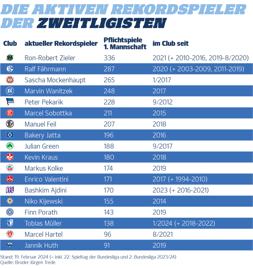 Und wie sieht’s in der 2. Bundesliga aus? Dort liegt der Spitzenreiter fast genau im besagten Mittel der Bundesliga-Profis. Die Rede ist von Hannovers Schlussmann Ron-Robert Zieler (35), der bisher 336 Pflichtspiele für die Roten absolviert hat. „Immer bei dir, 96 – HSV!“ galt für den gebürtigen Kölner dabei aber nicht. So stehen fünf weitere Profistationen in der Vita (Manchester United, Northampton Town, Leicester City, VfB Stuttgart und 1. FC Köln) des – welch überraschende Parallele zum Spitzenreiter-Duo Müller/Hummels – Weltmeisters von 2014.
